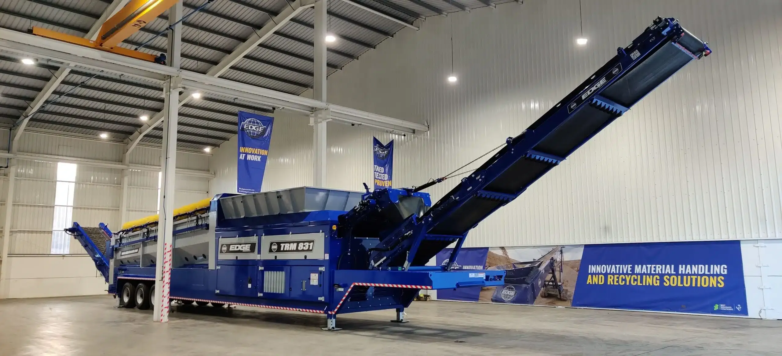 The EDGE TRM831 mobile trommel incorporates a host of impressive design features such as, a remote 180°radial fines conveyor as standard, an eco-power saving functionality which reduces unnecessary running costs and a user-friendly HMI control panel for the easy adjustment of machine parameters. An intelligent load management systems ensures that the trommel screen is always operating at optimum performance with minimal supervision. A large hopper opening combined with class leading belt widths allow for the quick and smooth flow of material through the trommel.